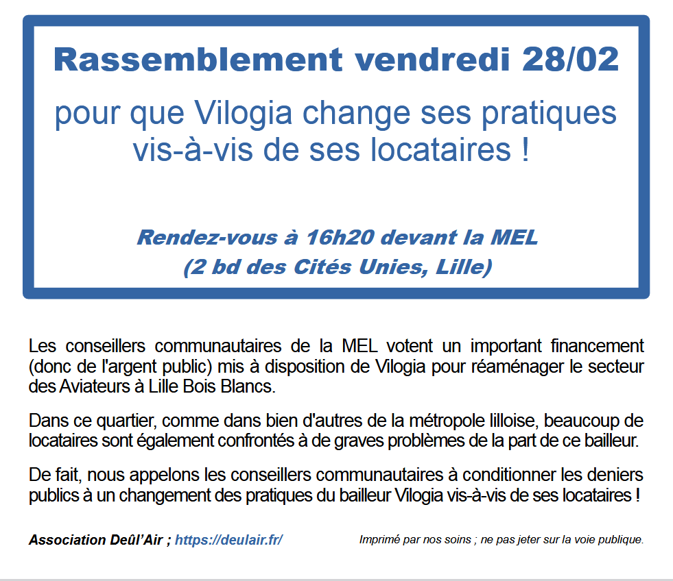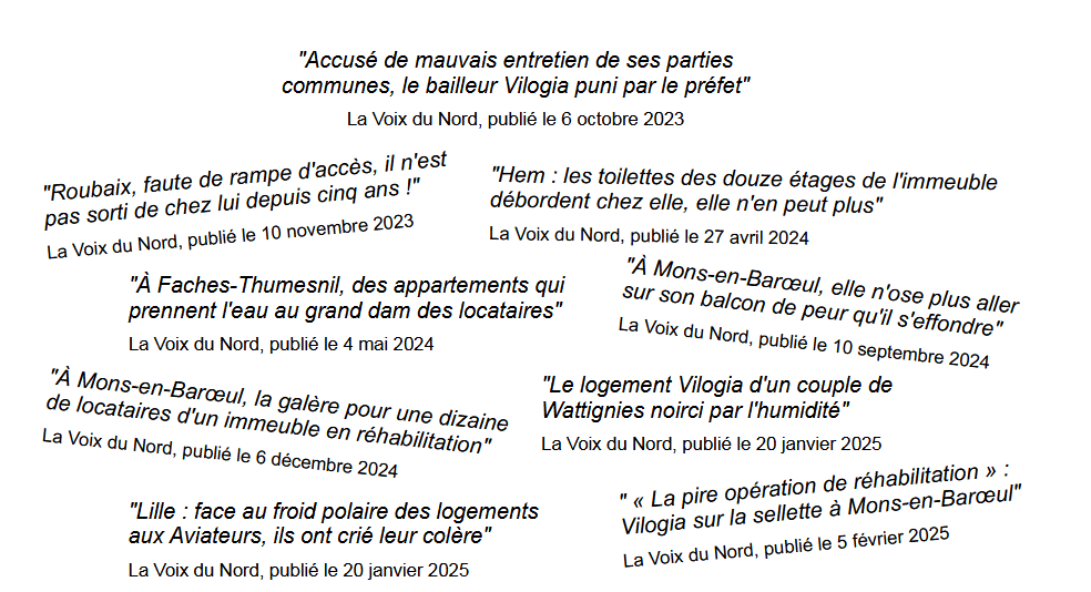 La semaine précédente nous avons pour la 14è fois, rencontré la Direction de Vilogia. Les problèmes individuels sont de plus en plus difficiles à régler, les relogements sont compliqués par la pénurie de plus en plus importante de logement dans la métropole lilloise.