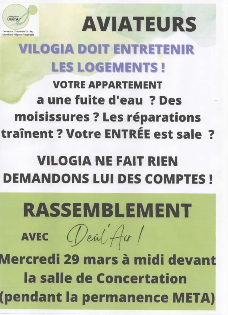 DEÛL’AIR ! propose aux habitants des BOIS BLANCS d’aller ensemble crier notre colère sous les fenêtres de la permanence que la META (VILOGIA et LMH) tient le mercredi 29 mars à midi salle de concertation – rue Mermoz