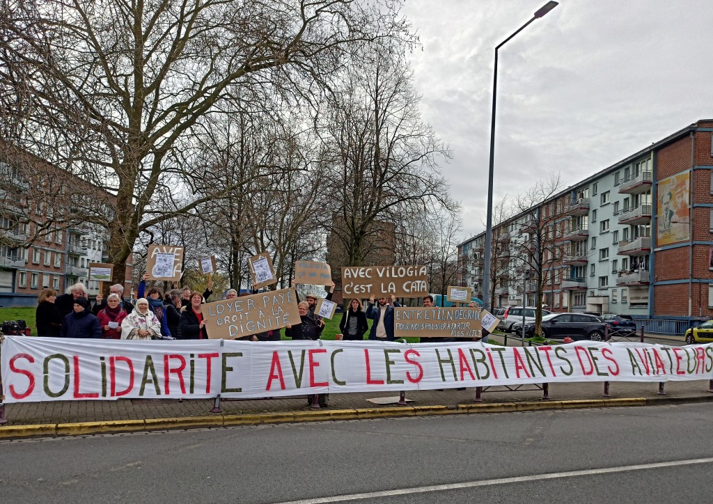 « On est là ! On est là ! Même si VILOGIA veut pas… » Un air bien connu modifié à la sauce Aviateurs* a résonné hier midi devant la permanence de la META (structure VILOGIA+LMH). Lundi la directrice de VILOGIA Lille avait écrit à Deûl’Air pour lui annoncer qu’en raison du rassemblement il n’y aurait pas de permanence de la META. Mais, hier mercredi, DEÛL’AIR avait maintenu son rassemblement et… VILOGIA sa permanence.